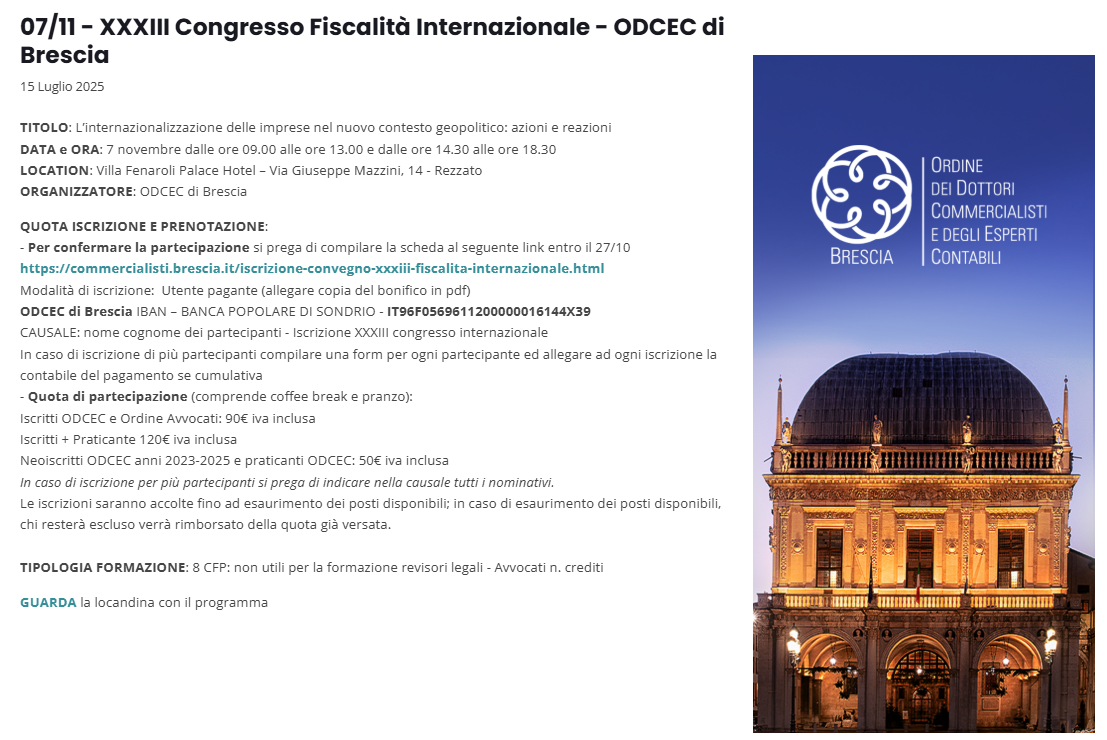 ODCEC di Brescia – XXXIII congresso di diritto e fiscalità – 07/11/2025